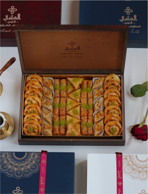 بوكس خشبي فاخر مشكل مكون من 56 قطعة منتقاة بعناية من أجود أنواع البقلاوة الشرقية الفاخرة.