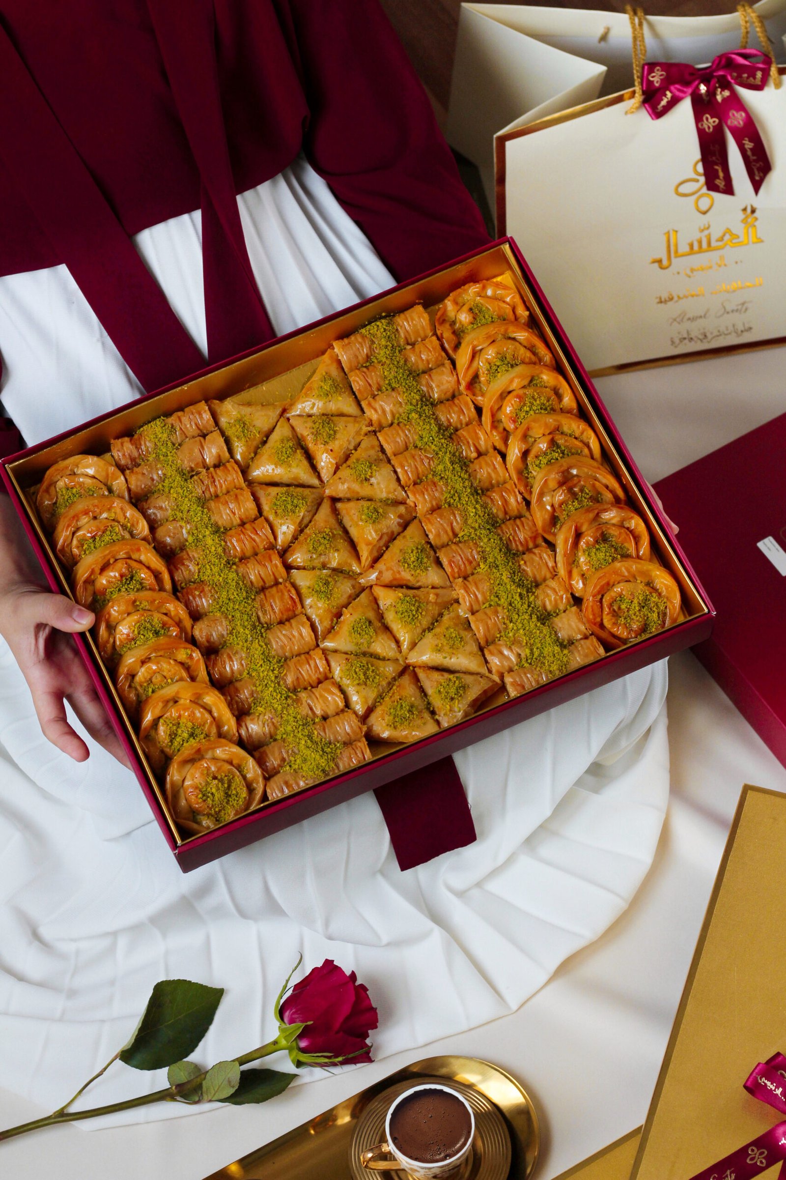+ Free Shippingبوكس ذهبي فاخر مشكل مكون من 56 قطعة منتقاة بعناية من أجود أنواع البقلاوة الشرقية الفاخرة.
